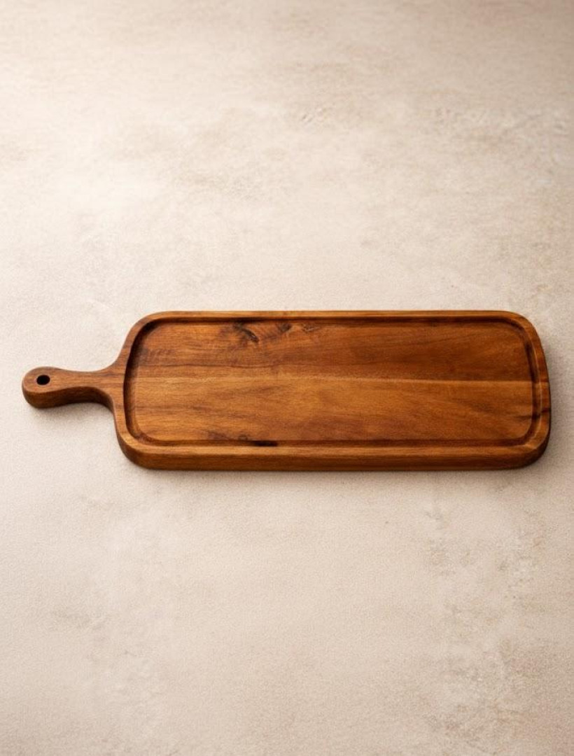 Elevate your hosting game with our Handcrafted Long Wooden Platter. Carved from a single piece of rich, sustainably sourced hardwood, this platter features a deep-set rim designed to keep your culinary creations securely in place. The perfect centerpiece for everything from artisanal charcuterie to decadent desserts.