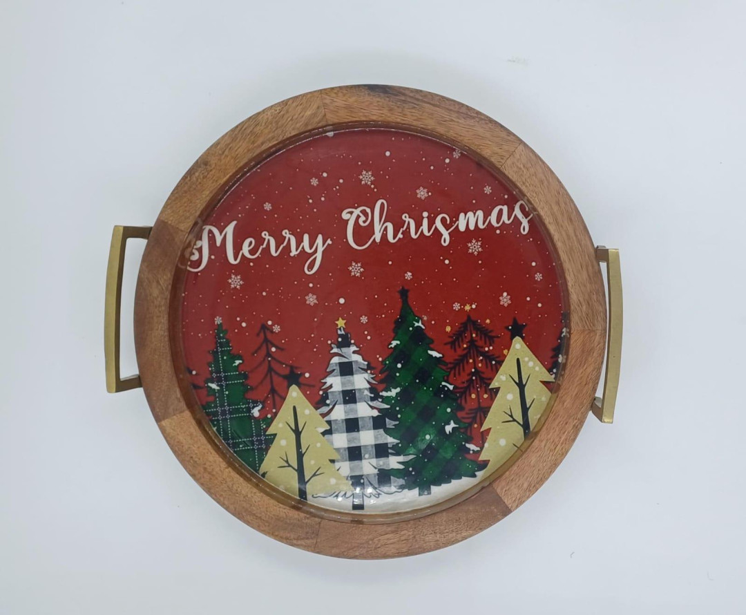Bring the warmth of the season to your tabletop. This handcrafted round serving tray combines the natural beauty of warm-toned wood with a vibrant, festive inlay. Featuring a charming forest of patterned trees.
