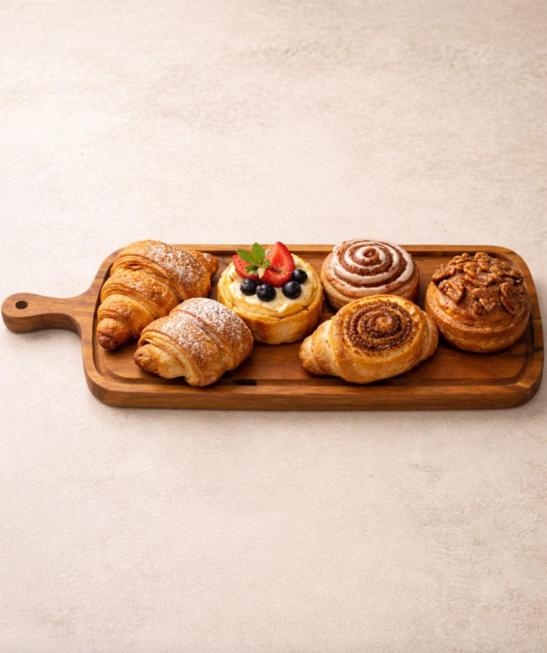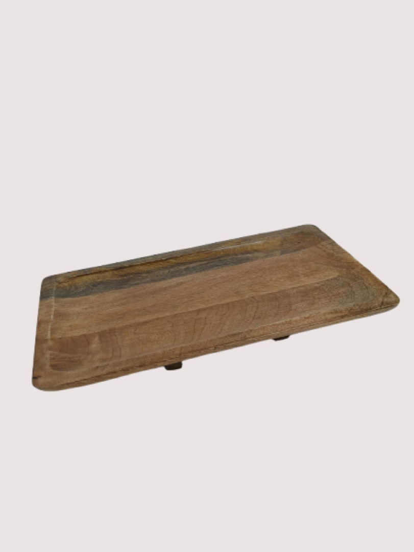 A durable and stylish solution for serving and display. This tray features a shallow basin to keep items secure and is supported by integrated wood feet for stability and ease of handling.